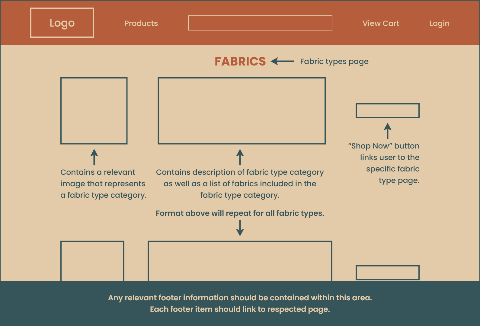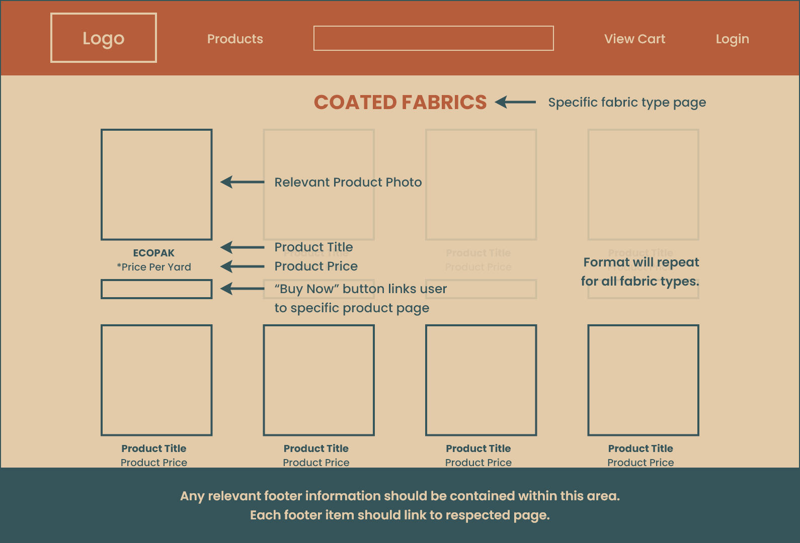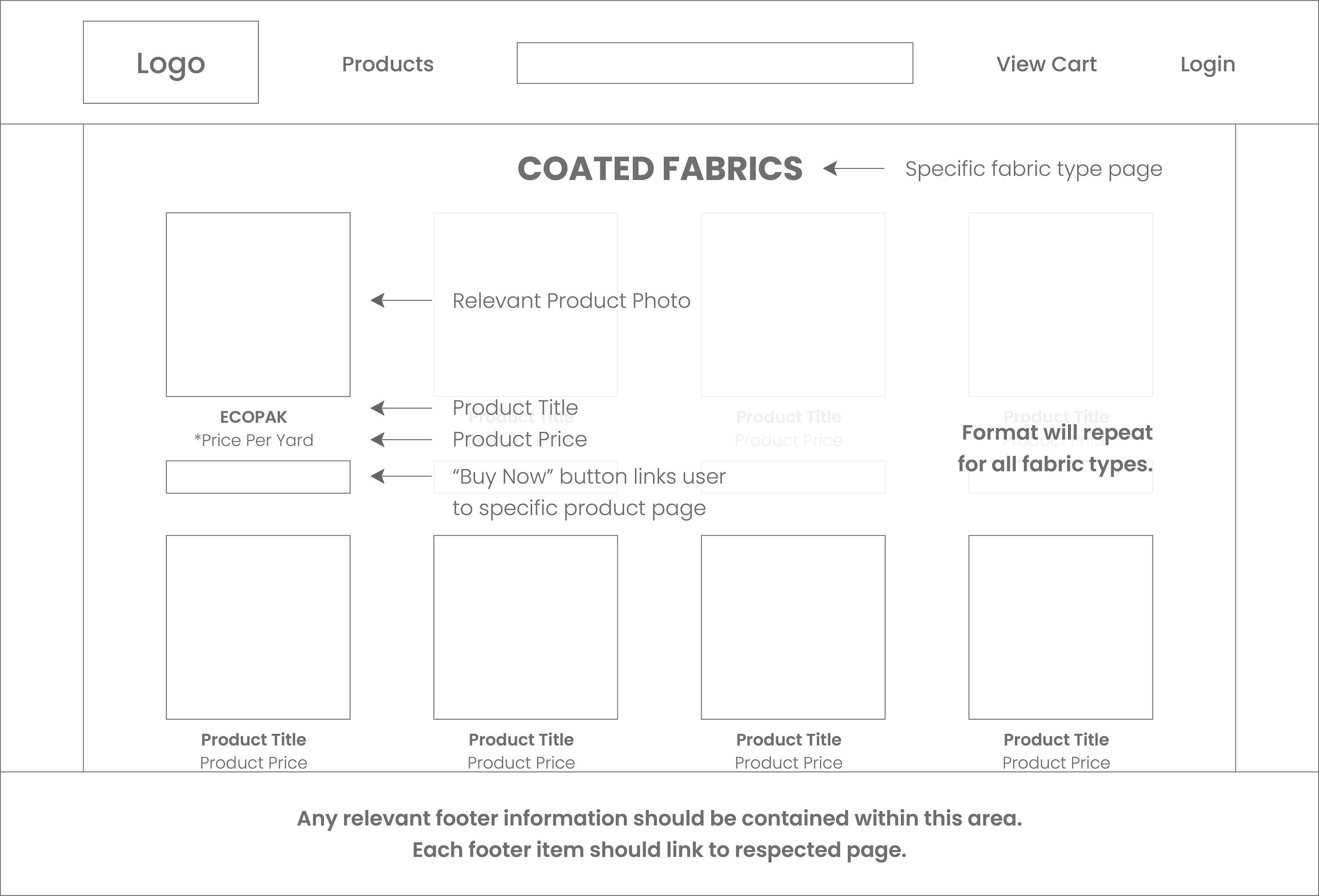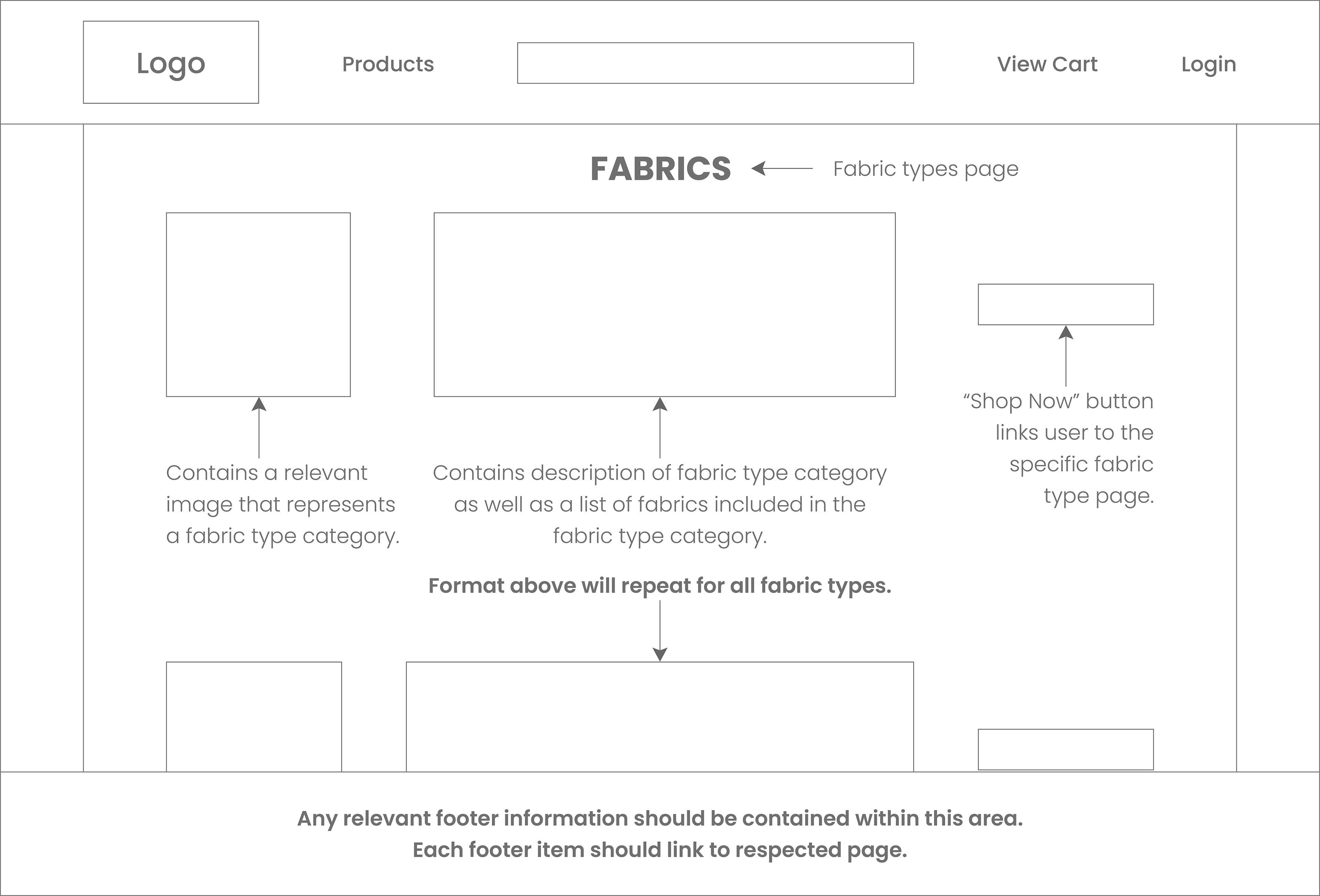 The purpose of a product category page is to group similar products together based on certain criteria, making it easier for users to browse and find items of interest. The functional job of a product category page is to provide a clear and organized layout that showcases various products within a specific category (fabric).