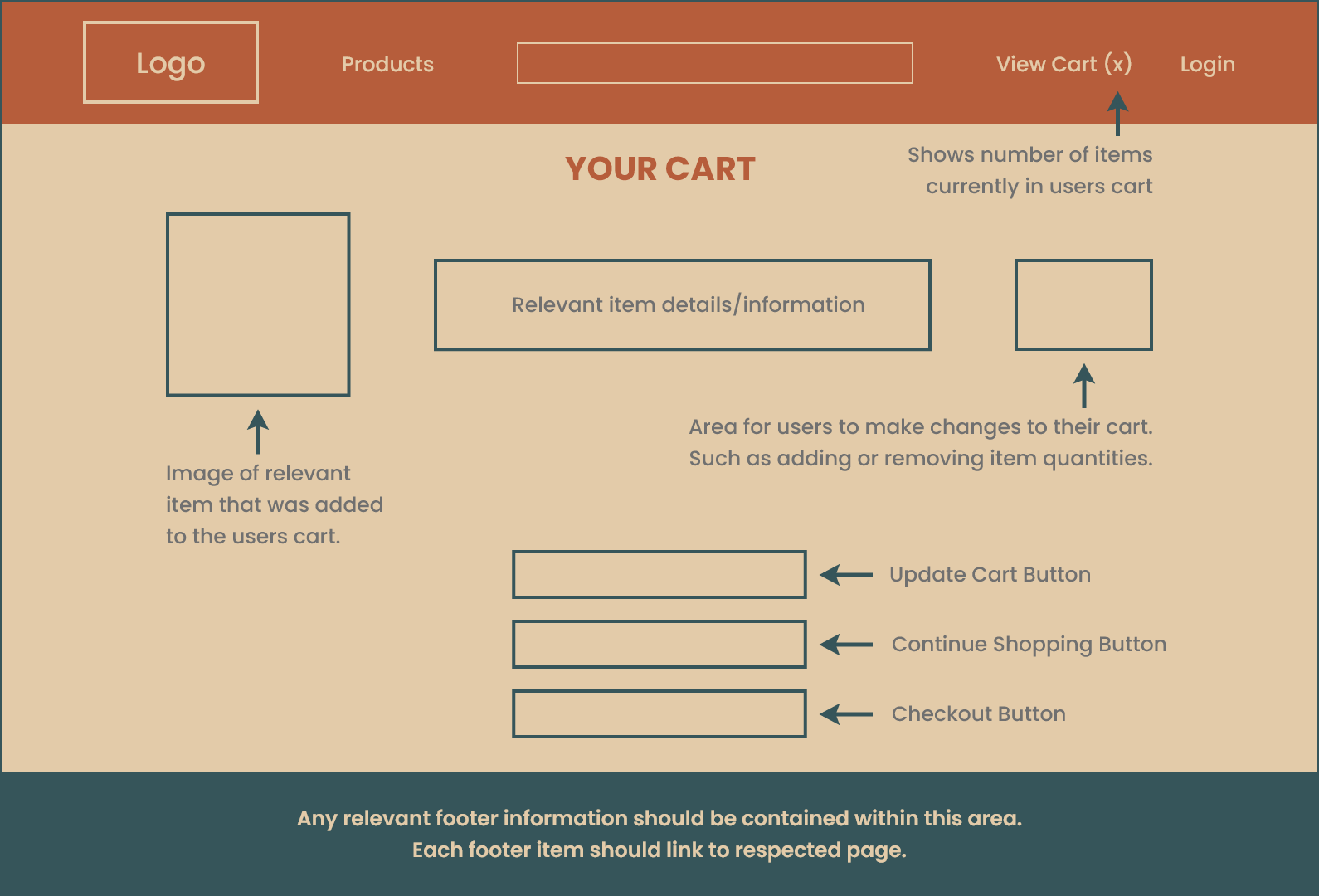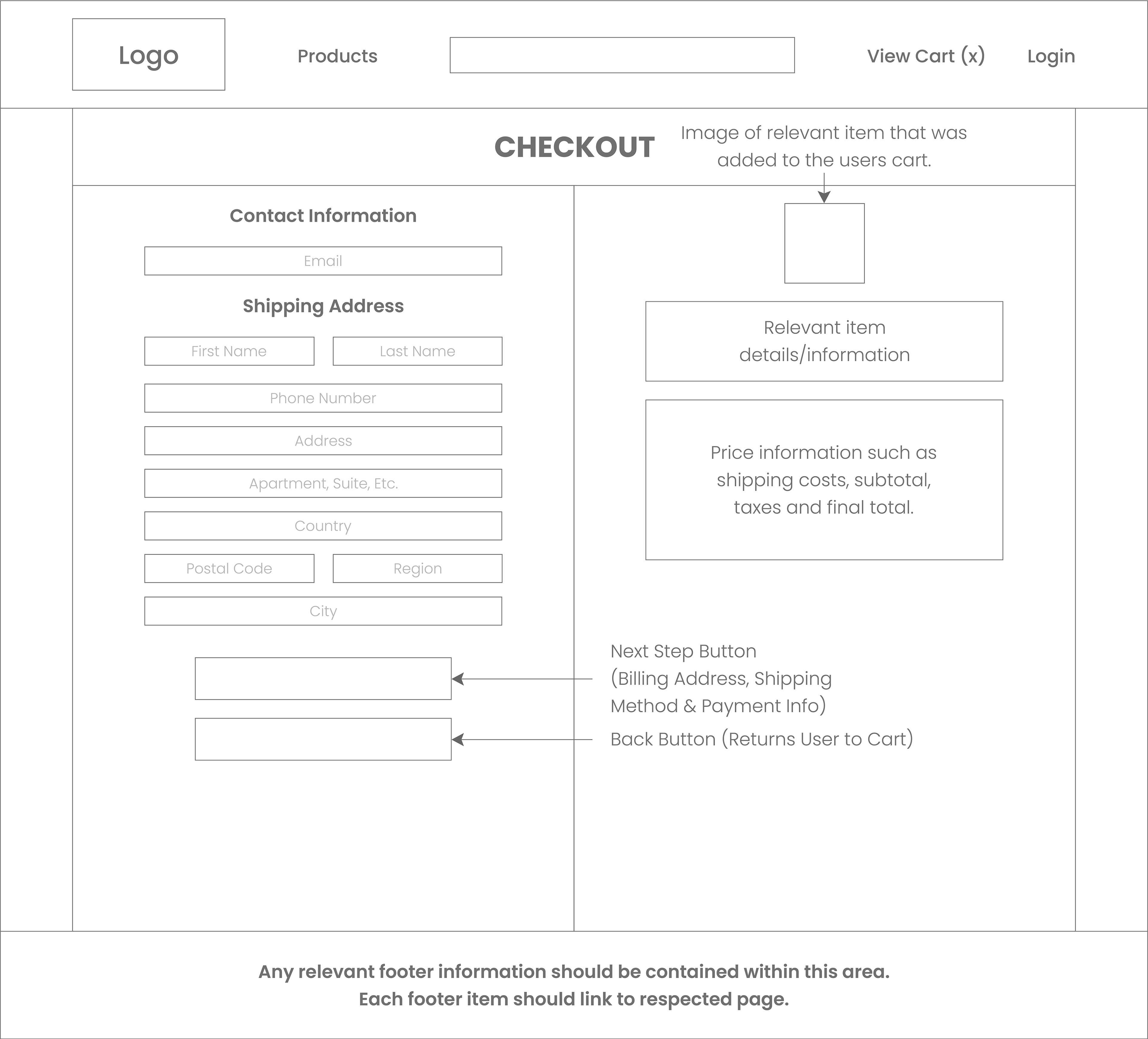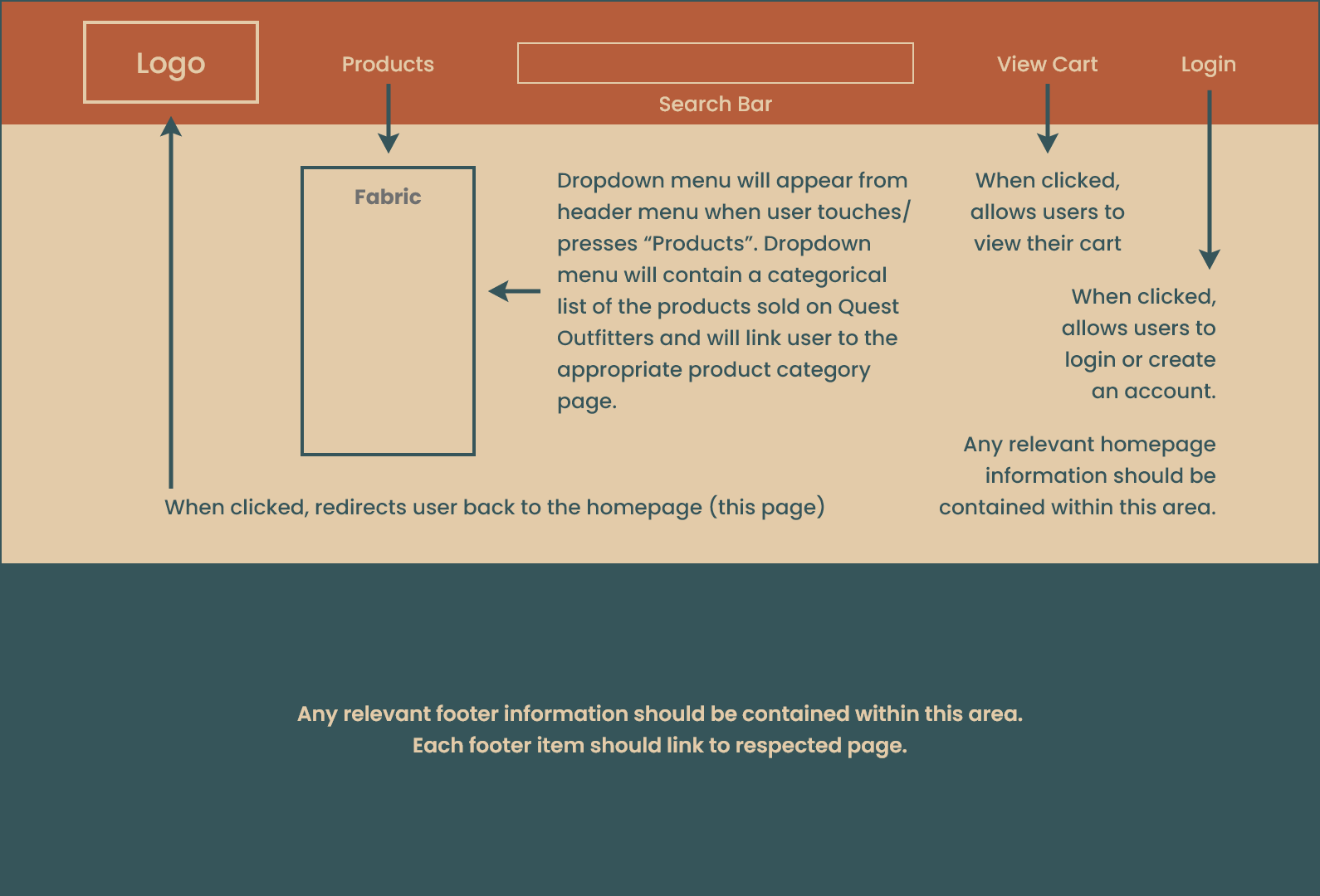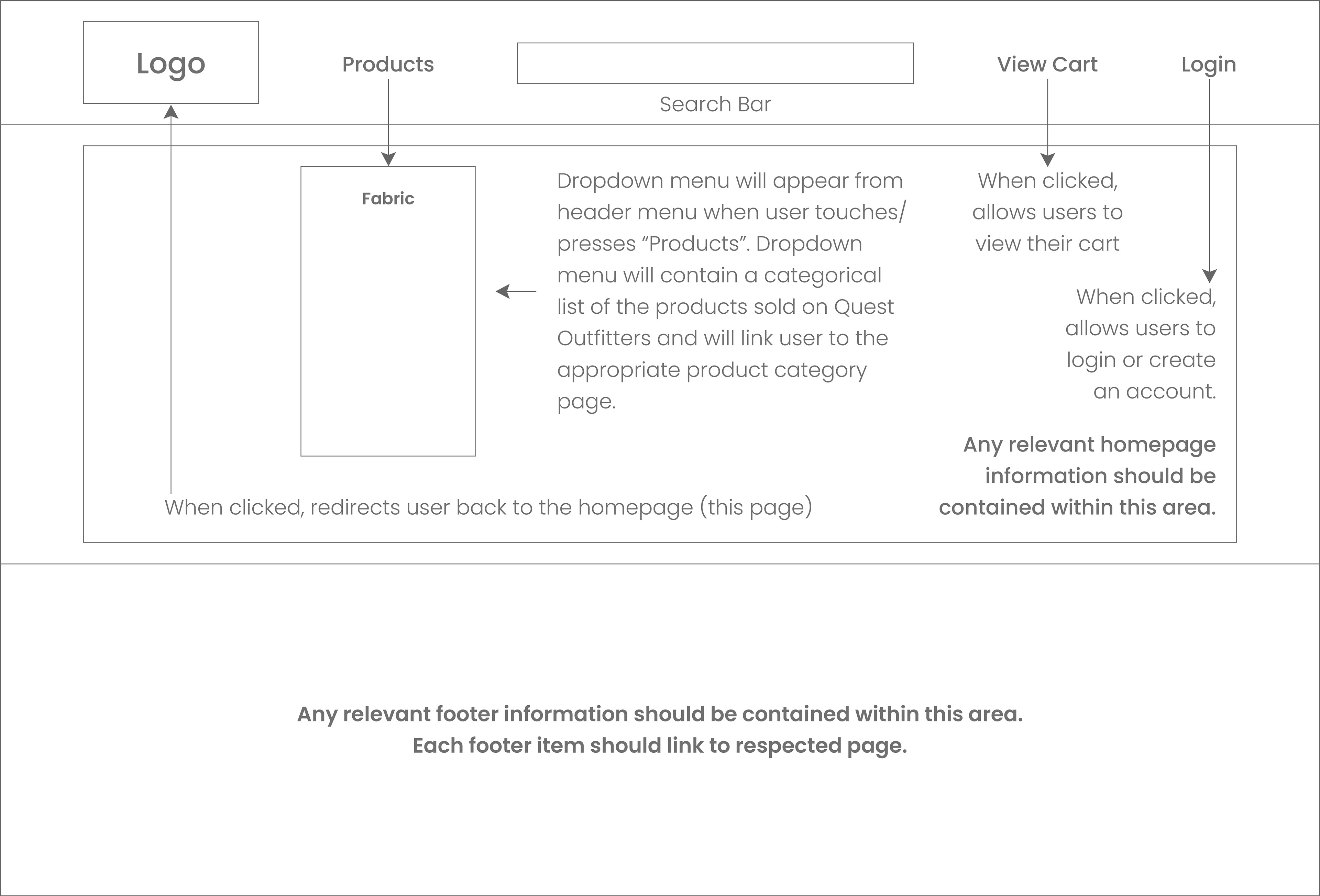 This work involved creating a set of conceptual wireframes for key pages within the Quest Outfitters e-commerce website, paired with clear functional descriptions for each page. The wireframes define page purpose, content hierarchy, and navigation structure across the shopping journey—from homepage discovery through checkout—ensuring each screen supports user goals, task flow continuity, and a cohesive end-to-end purchasing experience.
