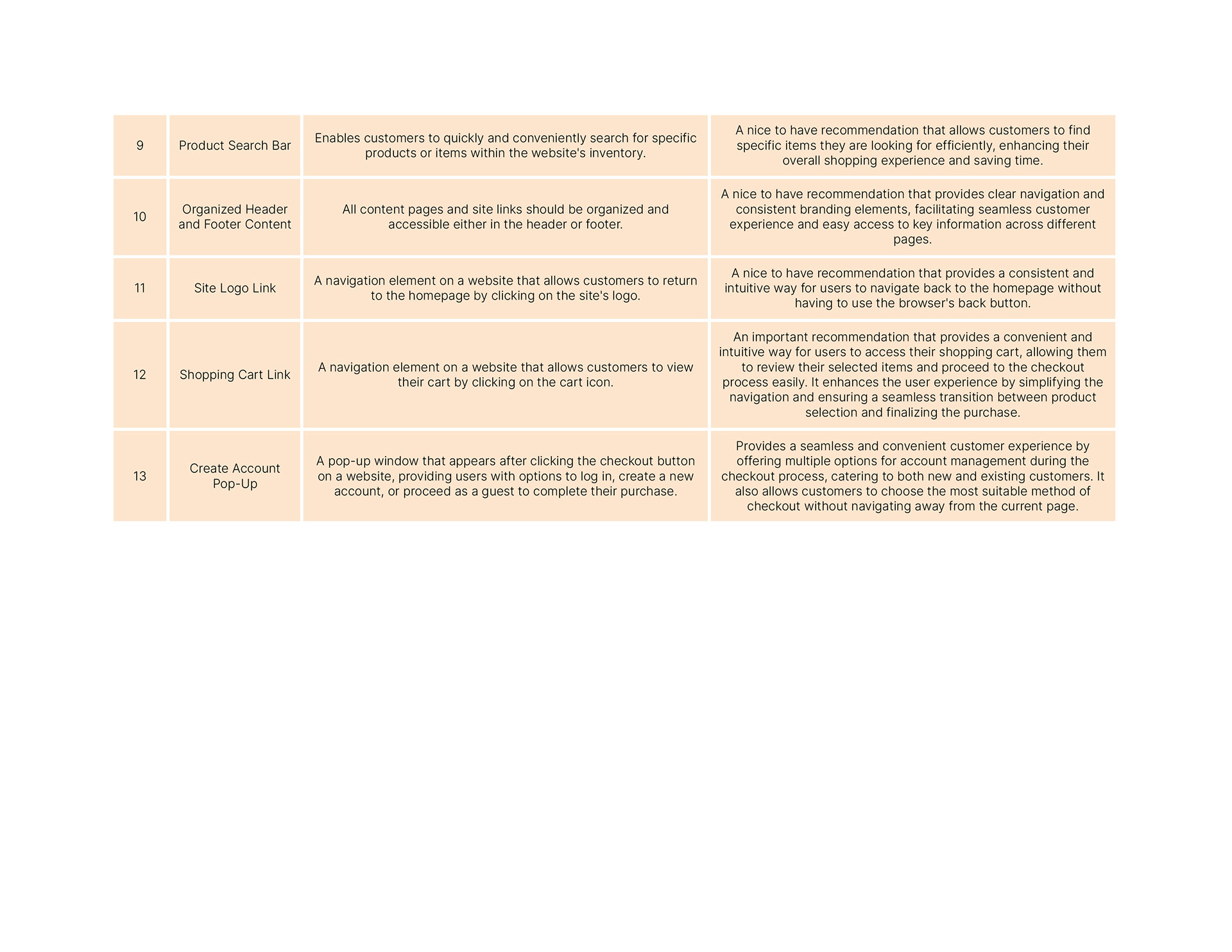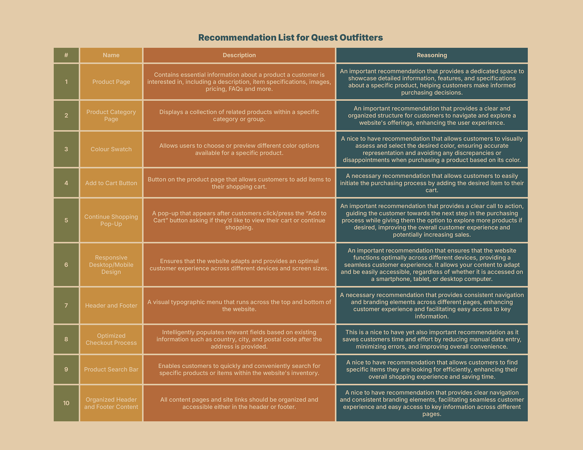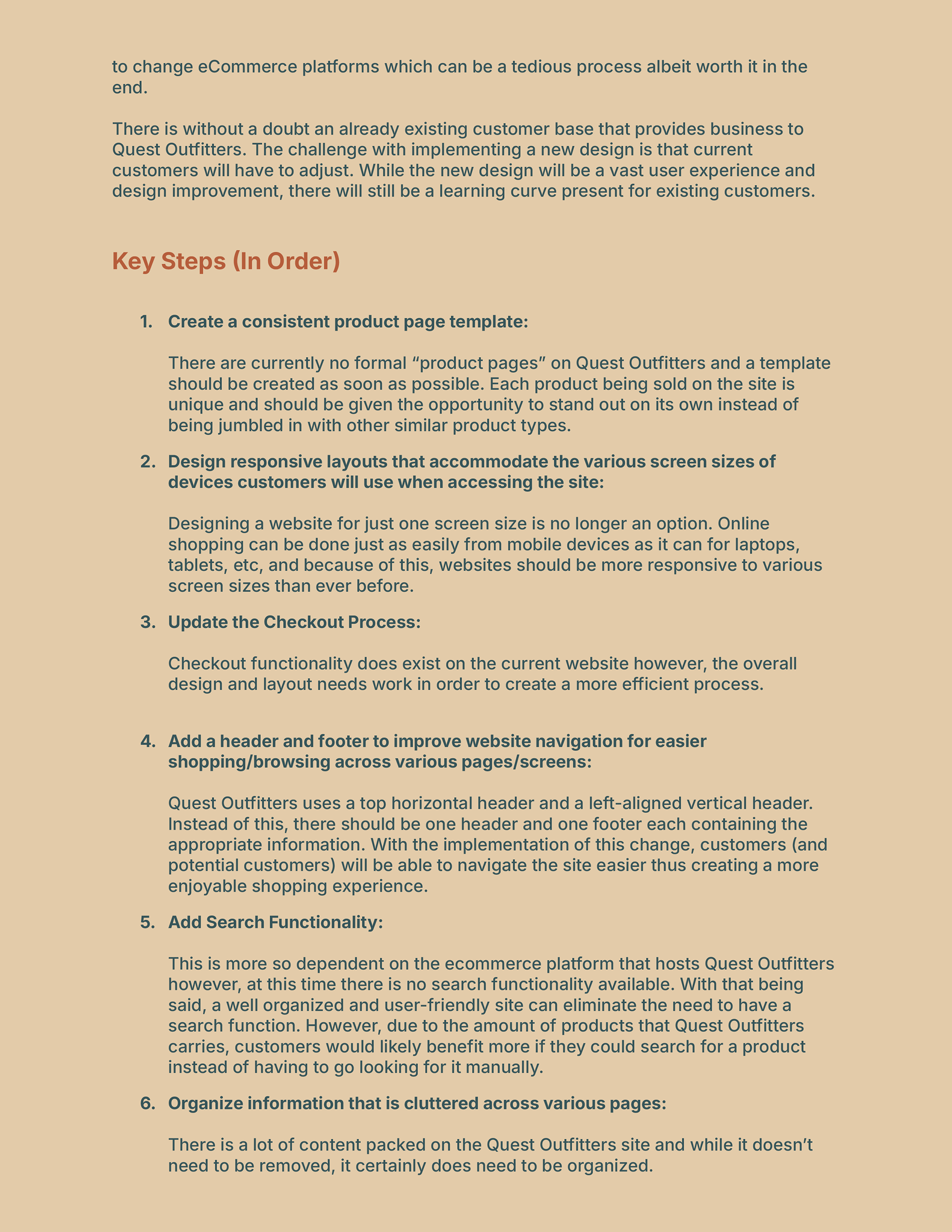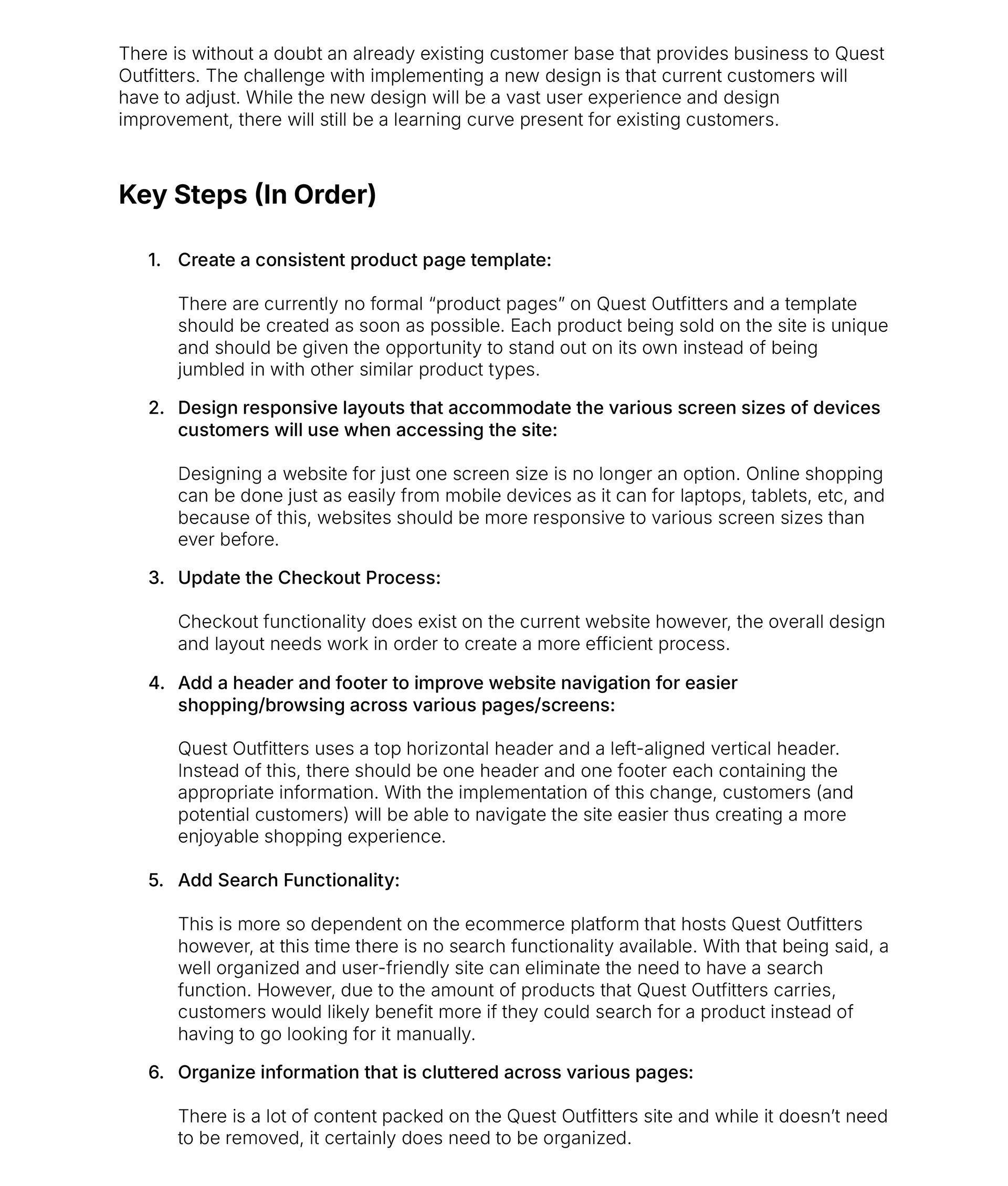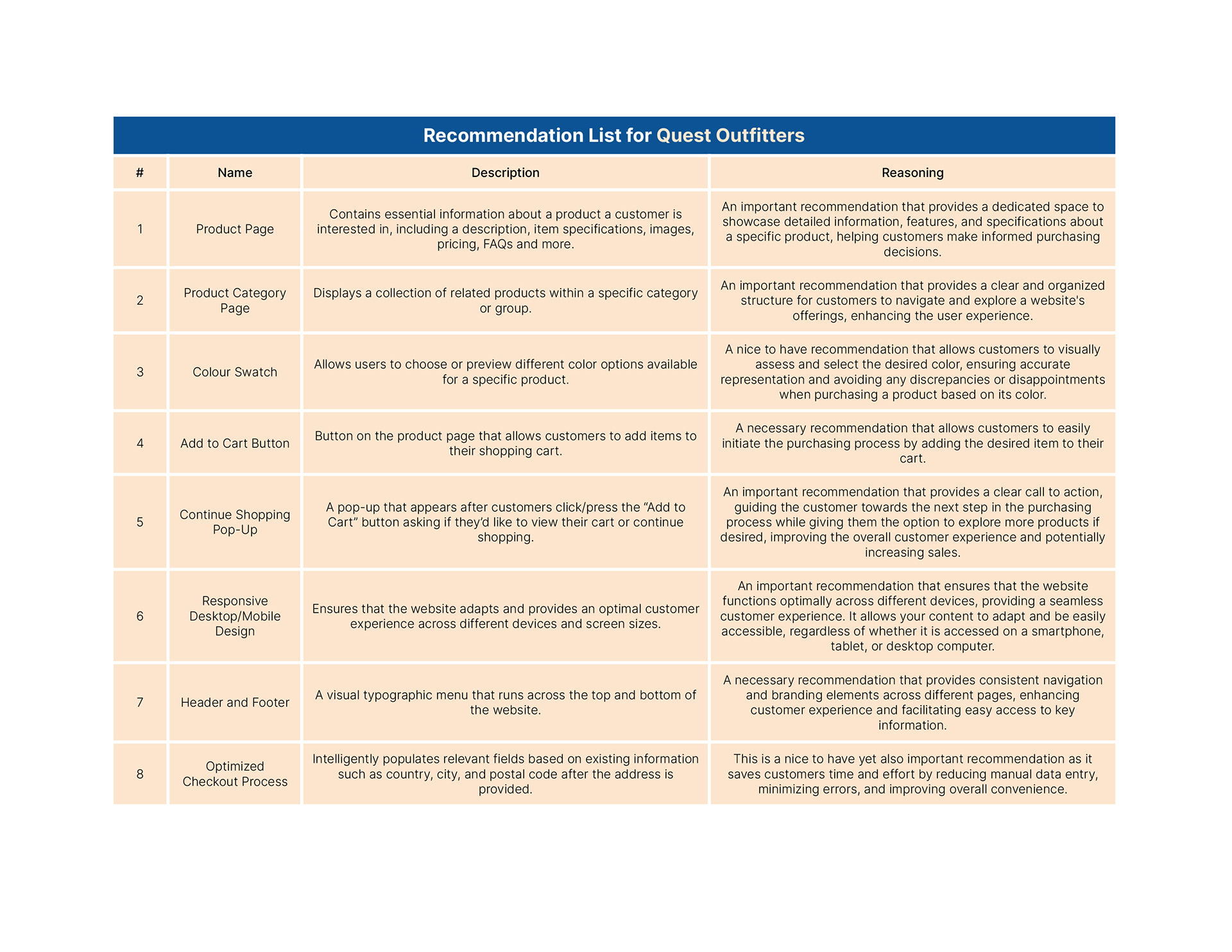 This recommendation list outlines a set of prioritized UX improvements for Quest Outfitters, focused on enhancing product discovery, navigation, checkout efficiency, and cross-device usability. Each recommendation is grounded in user needs identified through prior persona, scenario, and task flow analysis, and balances essential functionality with usability enhancements to support a more intuitive and effective online shopping experience.
