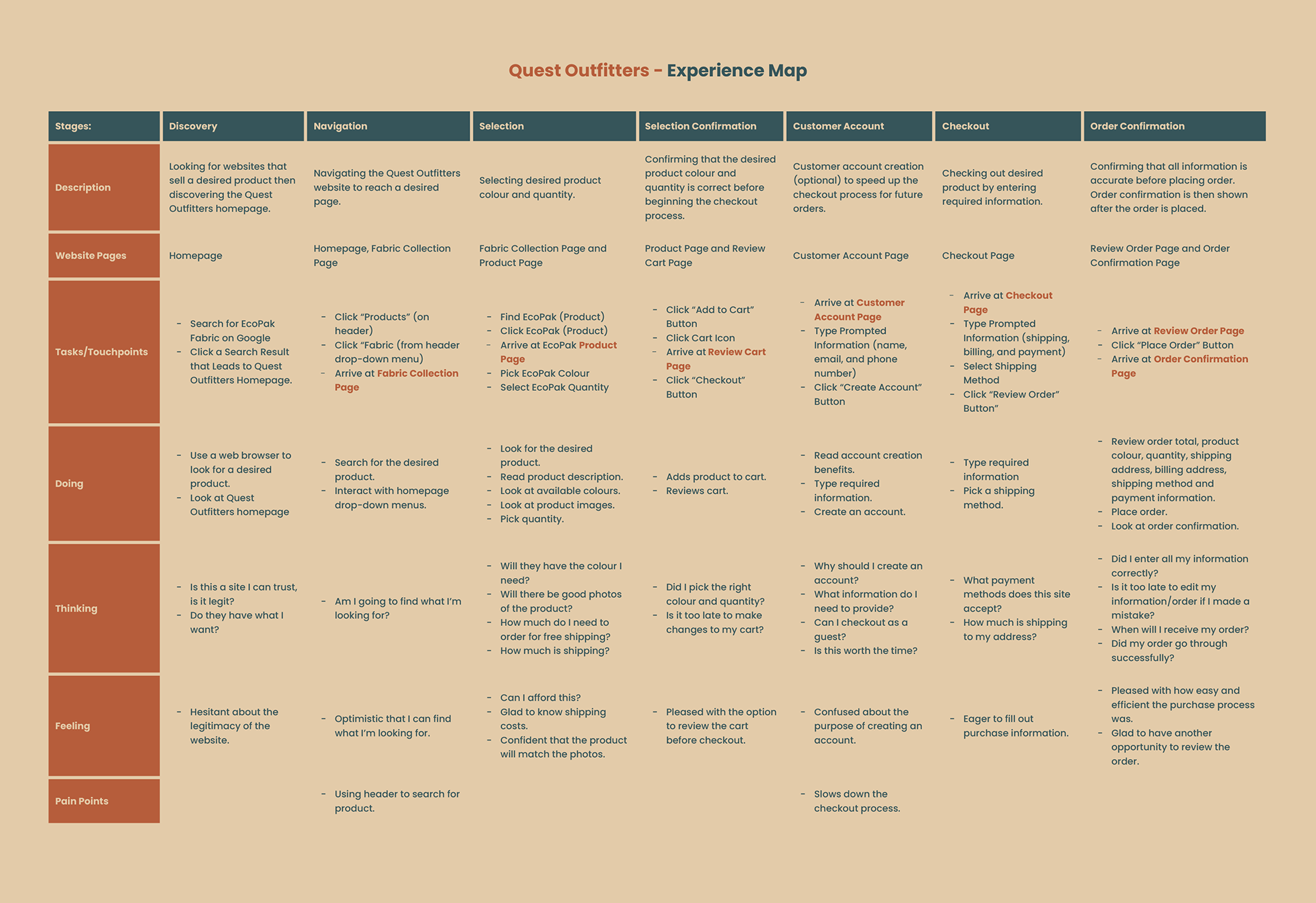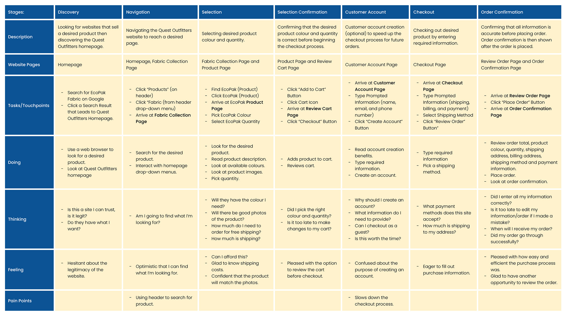 This experience map visualizes the end-to-end journey of a user completing an online purchase on Quest Outfitters. Based on insights from prior personas, user scenarios, and task flows, the map captures what the user is doing, thinking, and feeling at each stage of the transaction. The chosen format highlights emotional shifts, decision points, and friction areas, helping identify opportunities to improve usability and overall customer experience throughout the e-commerce flow.