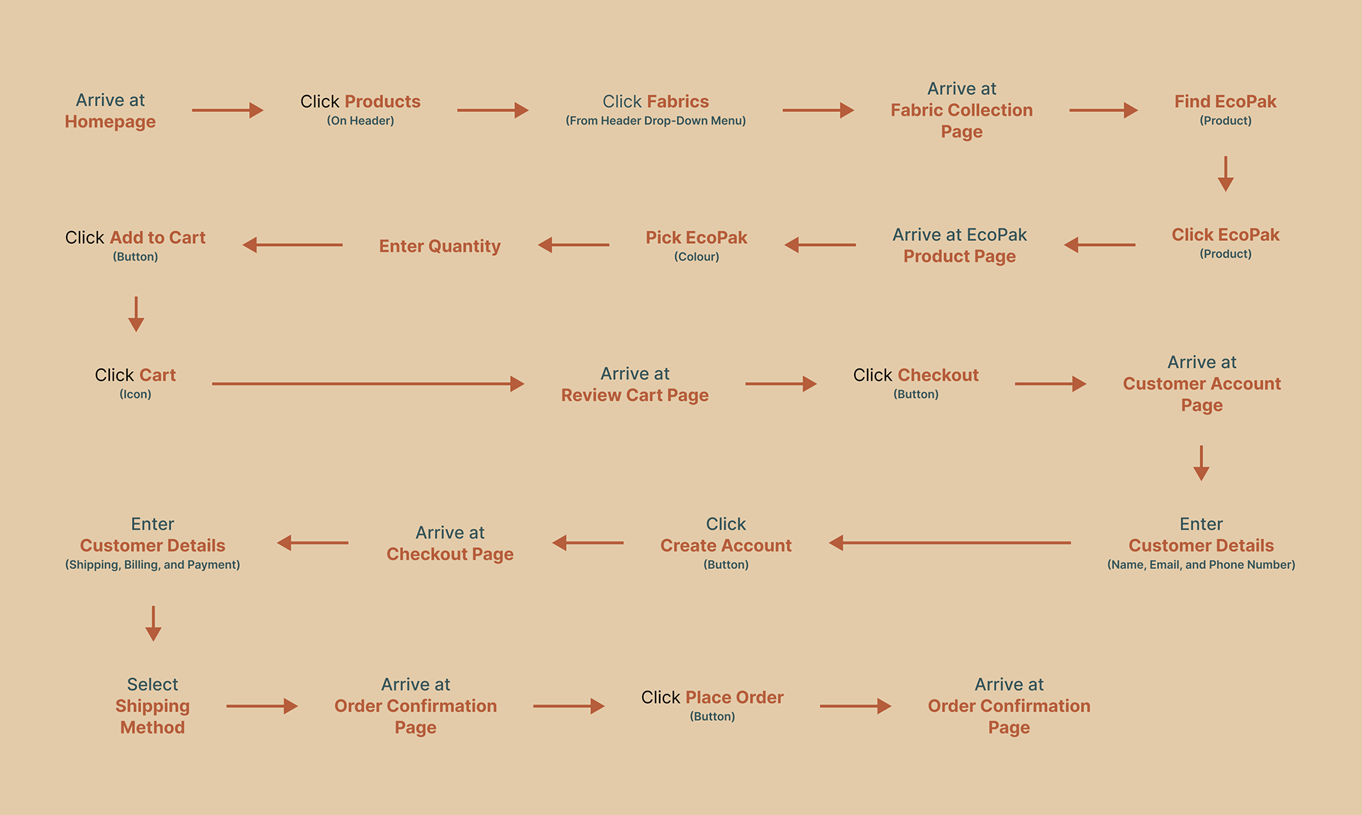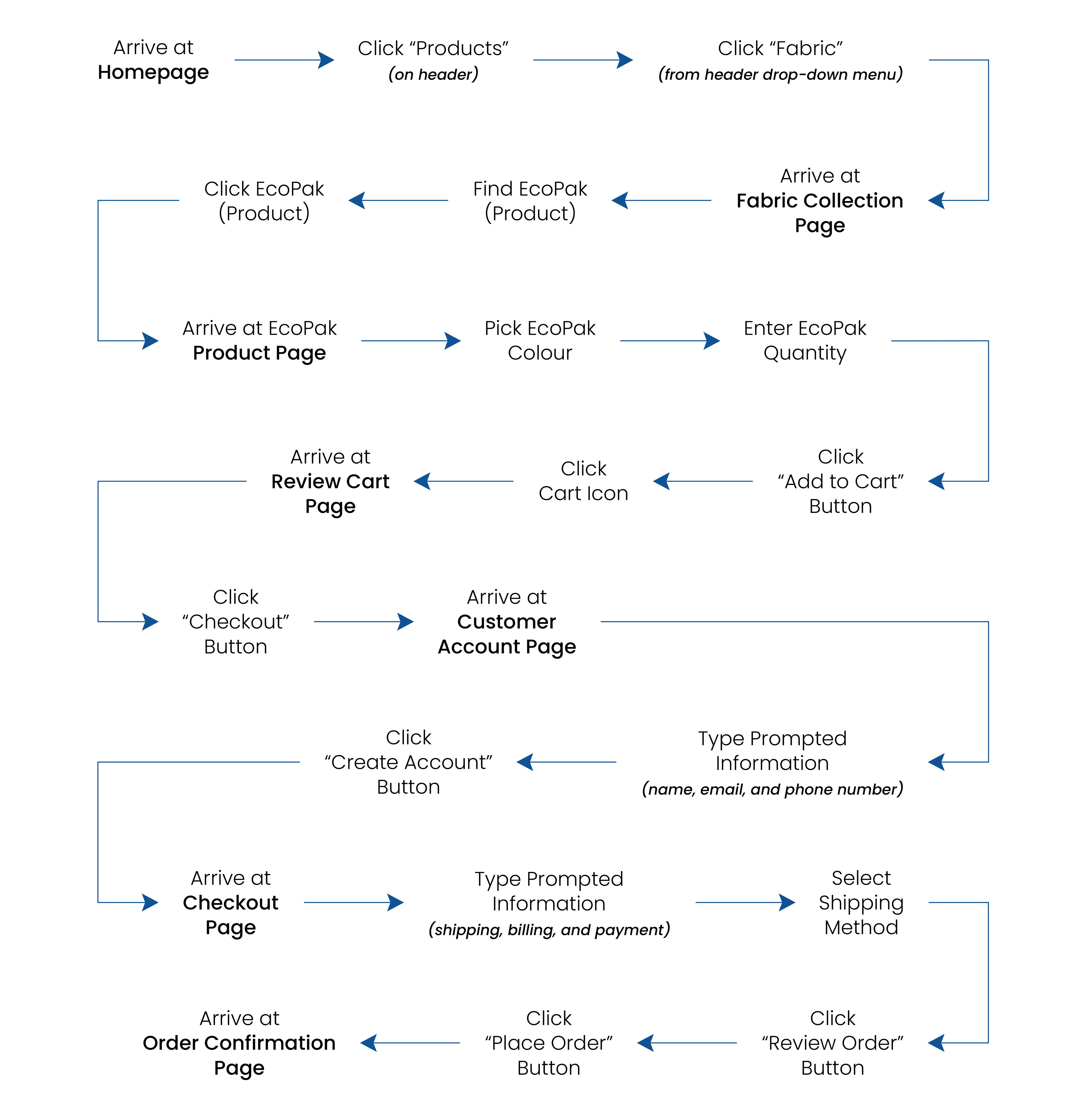 This user task flow translates the user scenario for Quest Outfitters into a structured sequence of actions and decision points required to complete a purchase. The flow highlights key steps, dependencies, and potential friction points in the e-commerce experience, providing a clear framework for evaluating usability and informing interface design improvements.