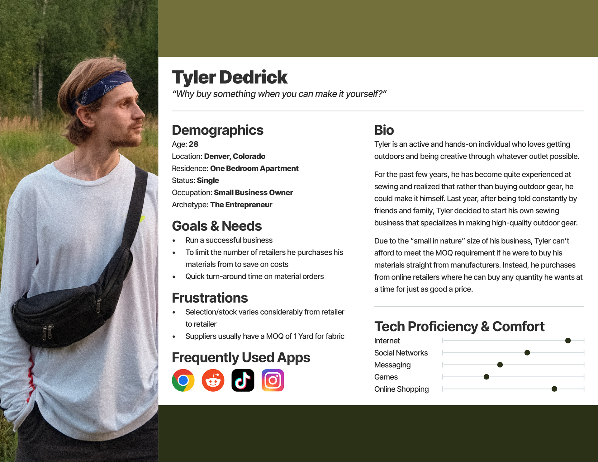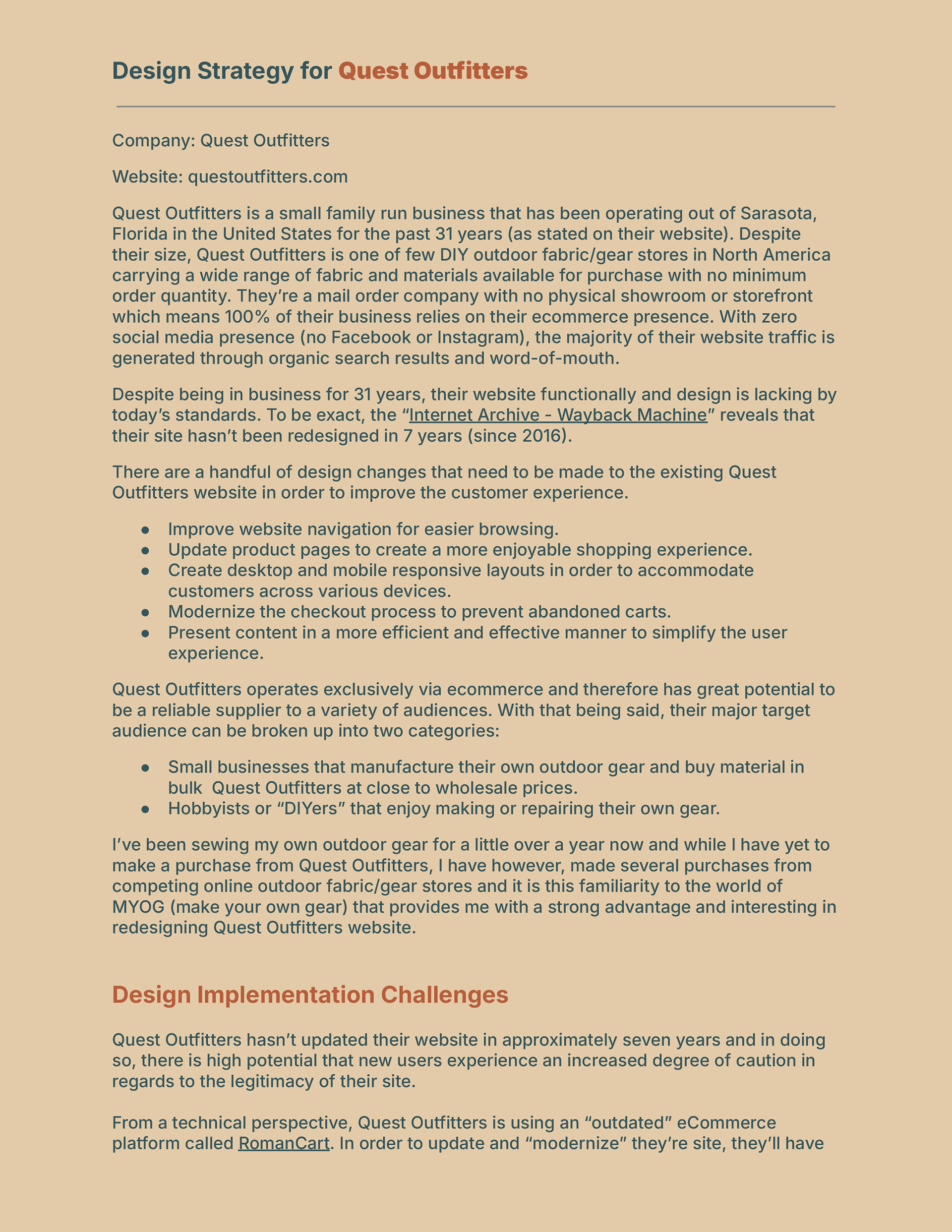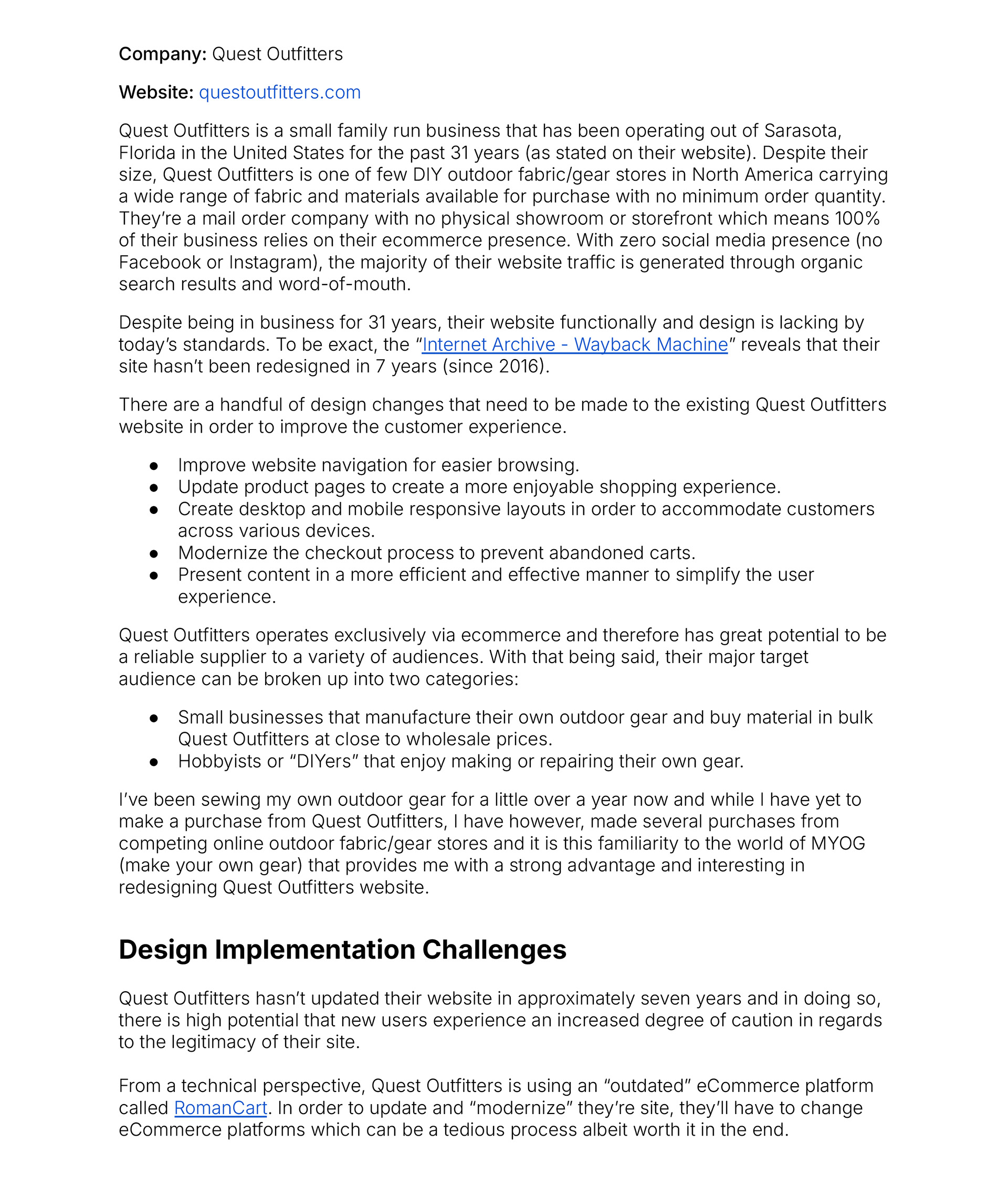 This project involved a user experience analysis and design strategy for Quest Outfitters, a long-standing, family-run e-commerce business specializing in DIY outdoor gear materials. The work evaluated usability, navigation, content structure, and checkout flow across desktop and mobile experiences, identifying key opportunities to modernize the site, improve customer trust, and support both small-business buyers and DIY hobbyists through a more intuitive, responsive shopping experience.