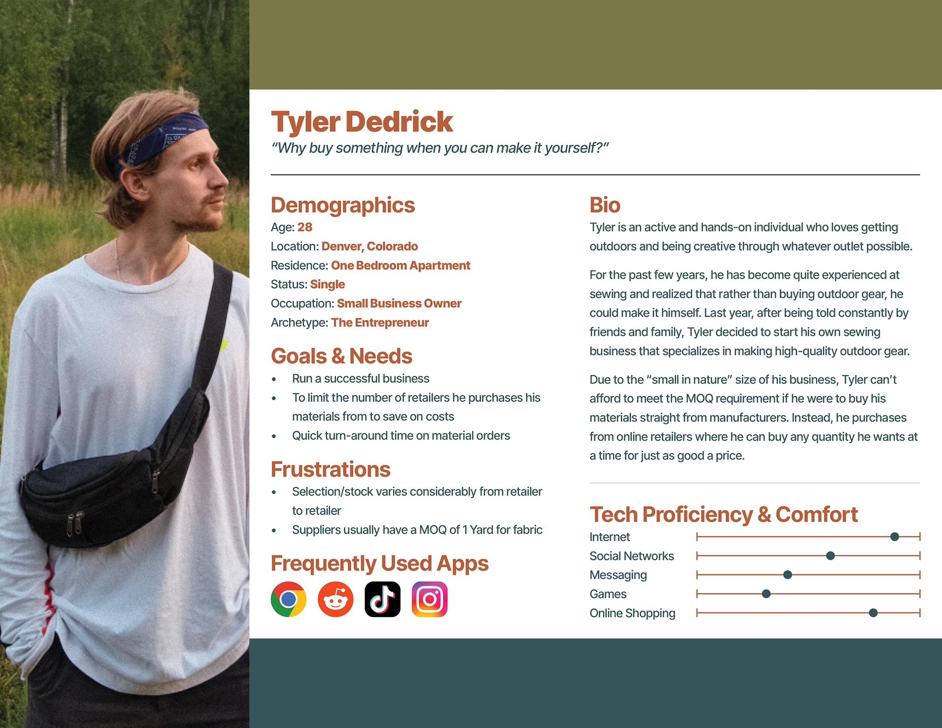 This deliverable focused on defining the primary user persona for Quest Outfitters through analysis of user characteristics, motivations, and purchasing behaviors within an e-commerce environment. The resulting persona represents the core audience and serves as a reference point for evaluating usability, guiding design decisions, and aligning future interface improvements with real user needs.