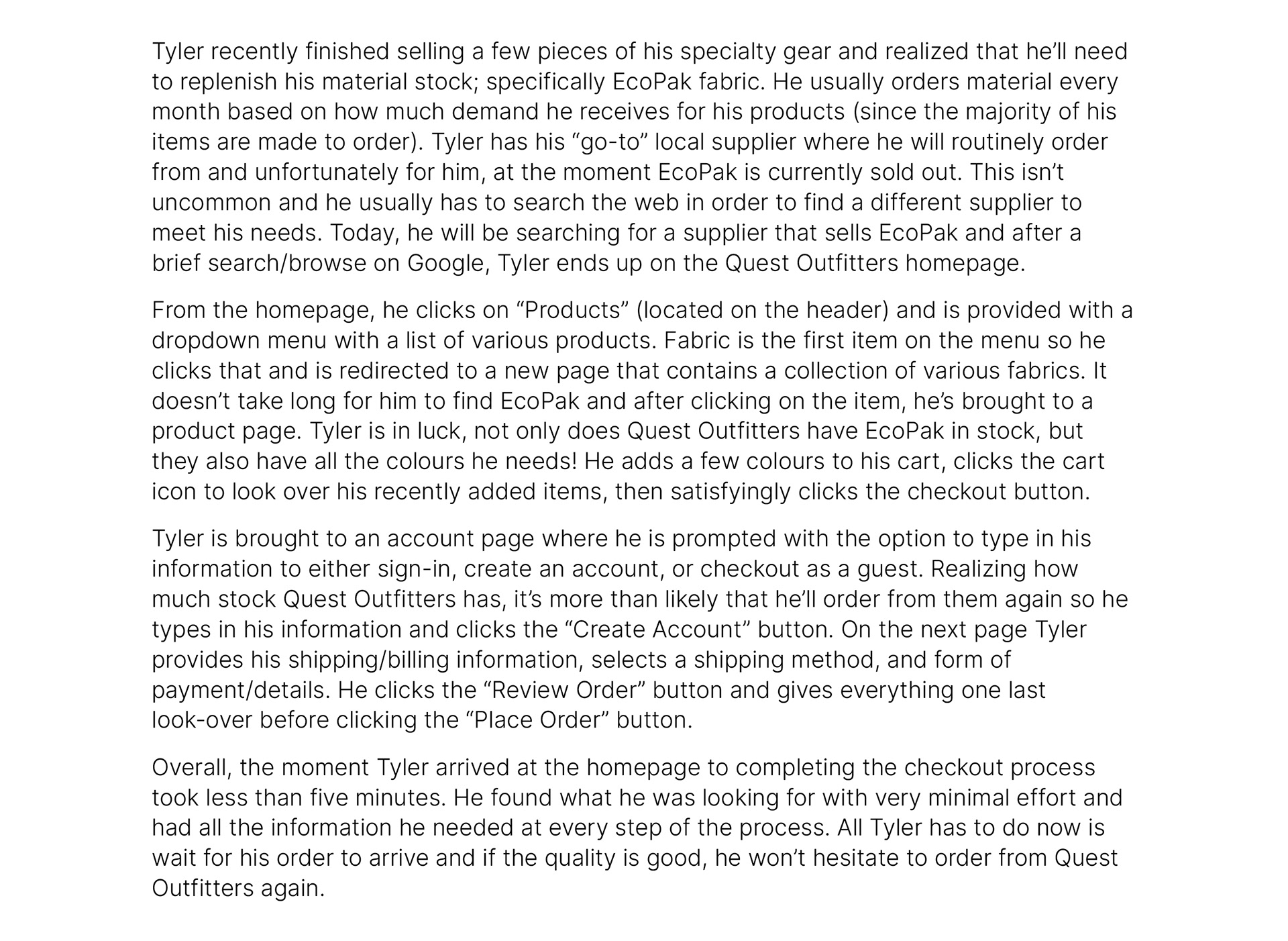 This user scenario places the primary persona for Quest Outfitters into a realistic purchasing context to illustrate their goals, motivations, and interactions with the website. Written as a short narrative, the scenario demonstrates how the user navigates the site to complete a purchase, helping translate persona insights into concrete user behaviors that inform task flow analysis and design decisions.