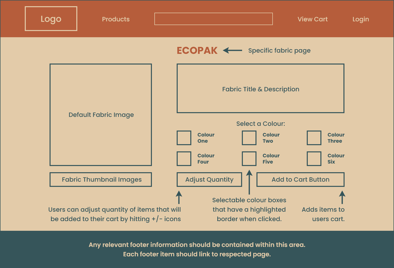 From the homepage, he clicks on “Products” (located on the header) and is provided with a dropdown menu with a list of various products. Fabric is the first item on the menu so he clicks that and is redirected to a new page that contains a collection of various fabrics. It doesn’t take long for him to find EcoPak and after clicking on the item, he’s brought to a product page. Tyler is in luck, not only does Quest Outfitters have EcoPak in stock, but they also have all the colours he needs! He adds a few colours to his cart, clicks the cart icon to look over his recently added items, then satisfyingly clicks the checkout button.
