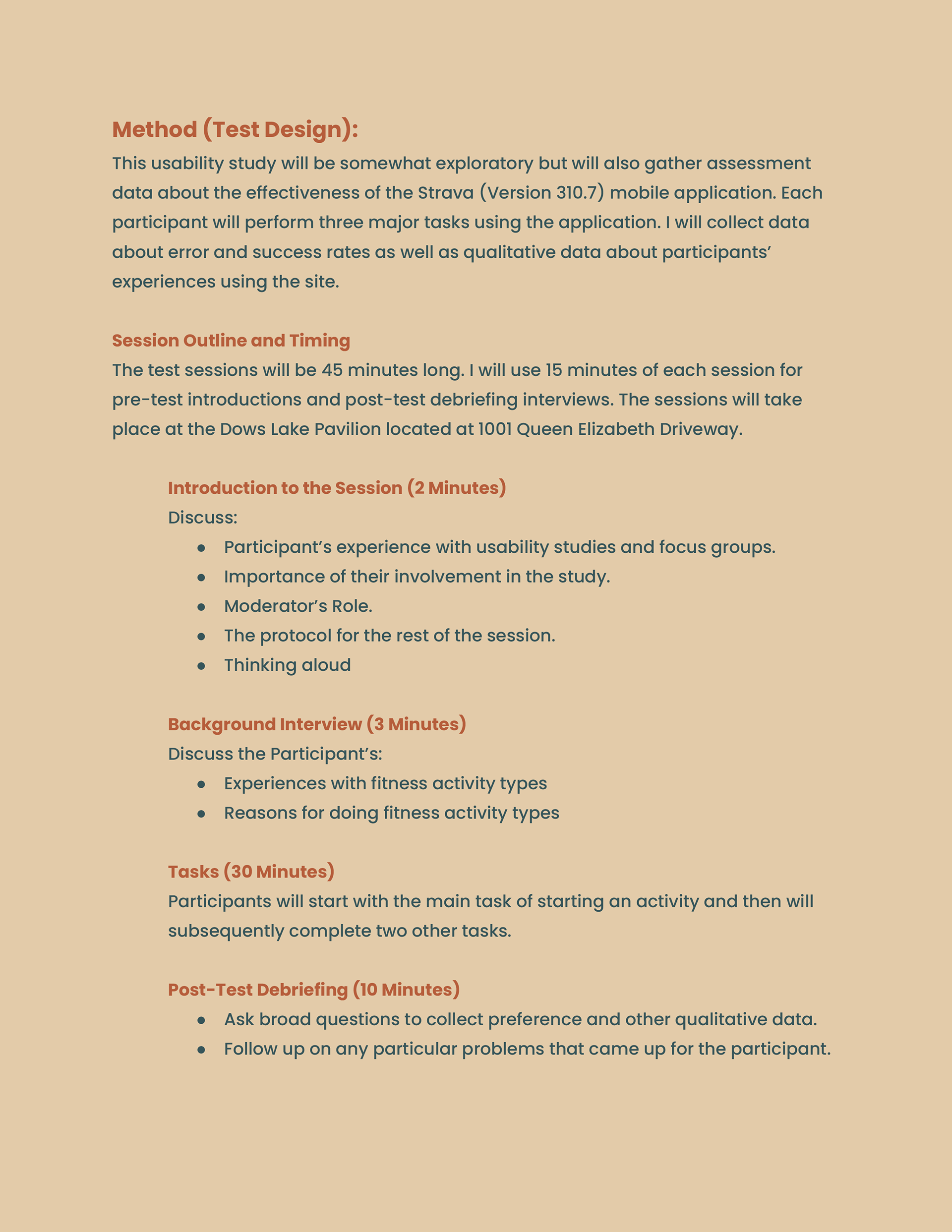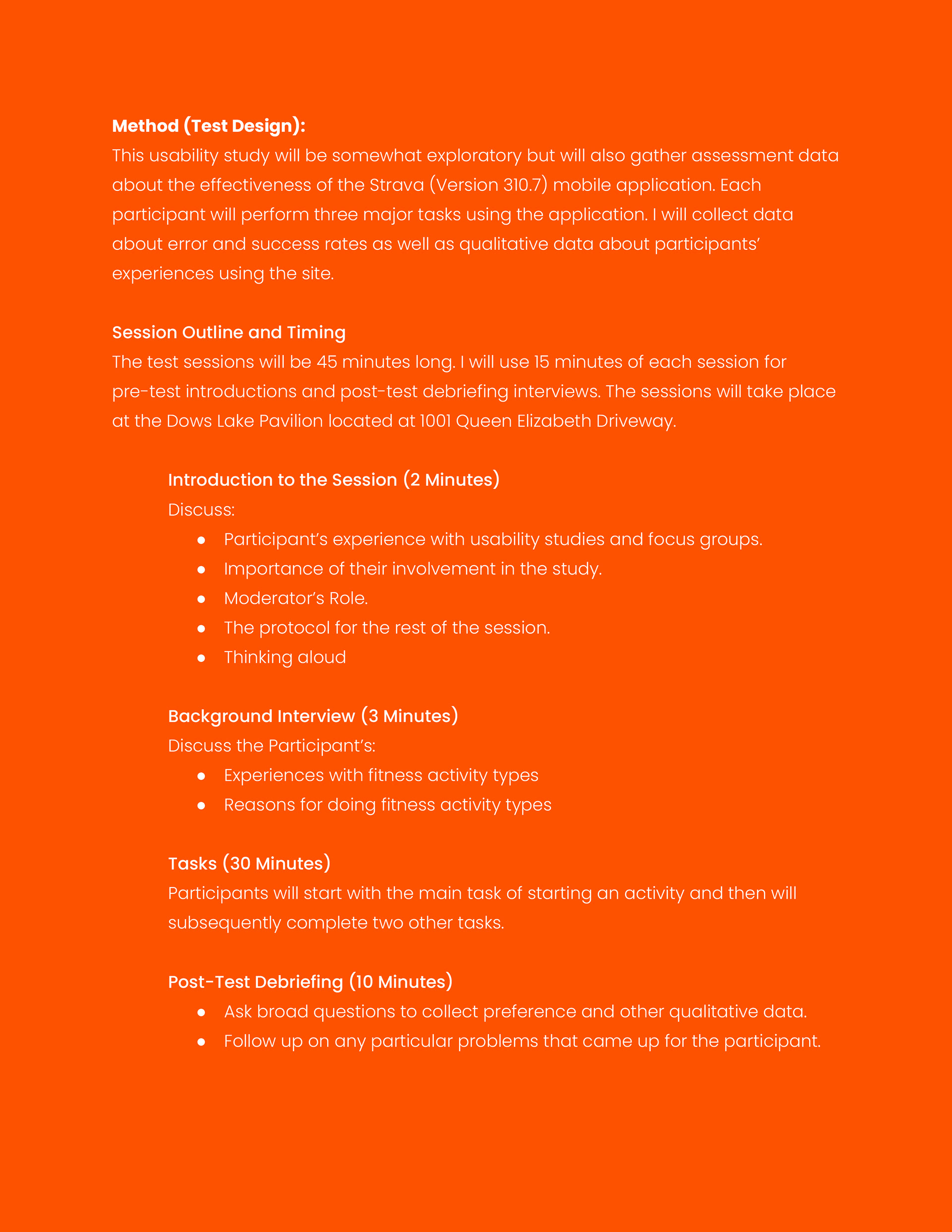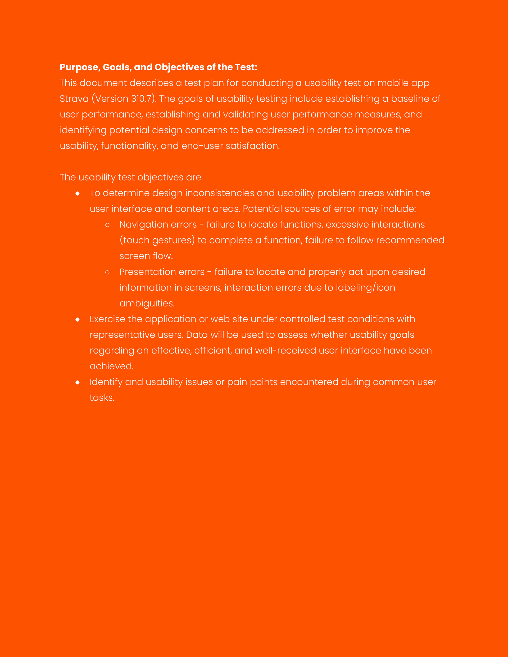 This work involved developing a comprehensive usability test plan for the Strava mobile application. The plan defined research goals, participant characteristics, test methods, task scenarios, and success criteria to evaluate navigation, activity tracking, data presentation, and social features. The study was designed to collect both qualitative and quantitative data to identify usability issues, assess user satisfaction, and inform actionable recommendations for improving the mobile user experience.