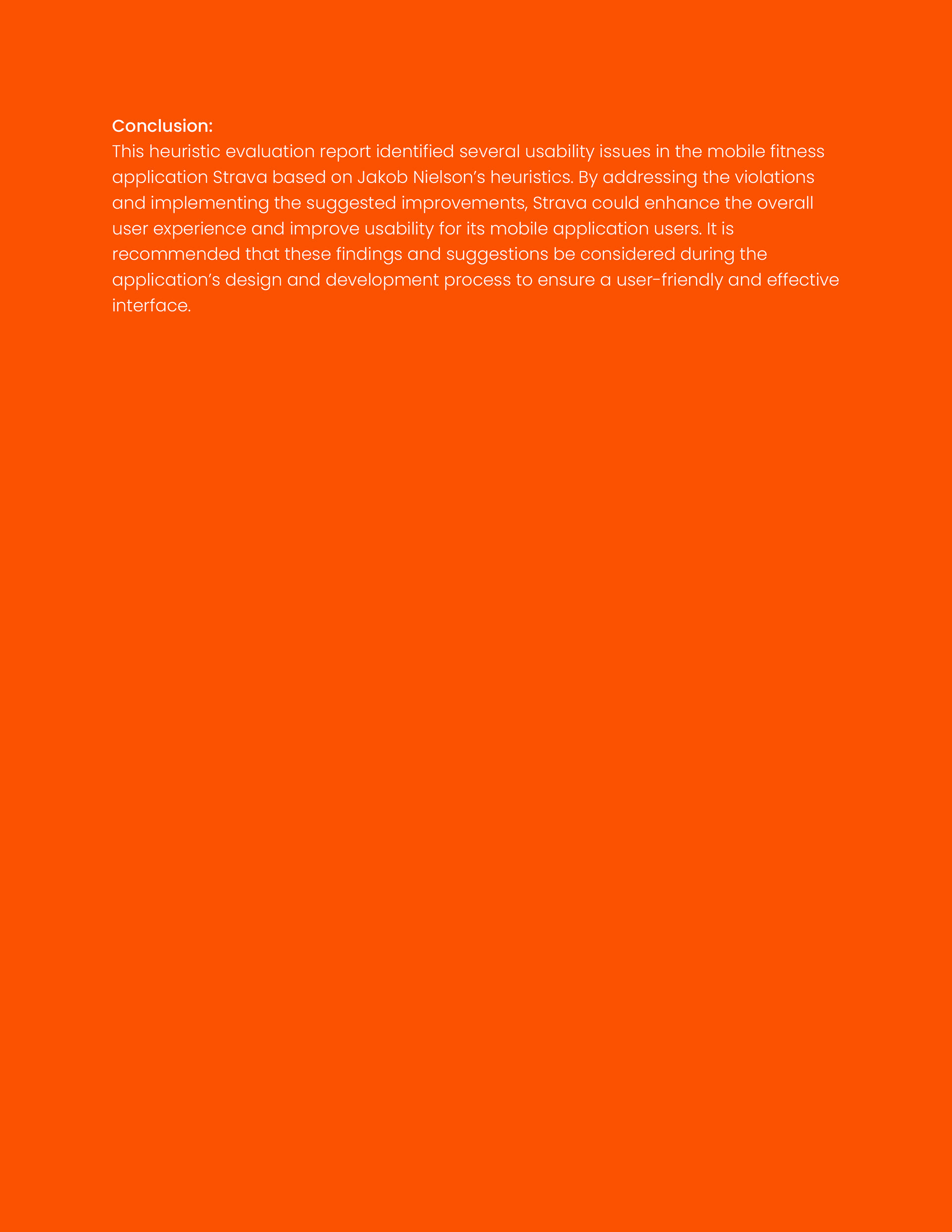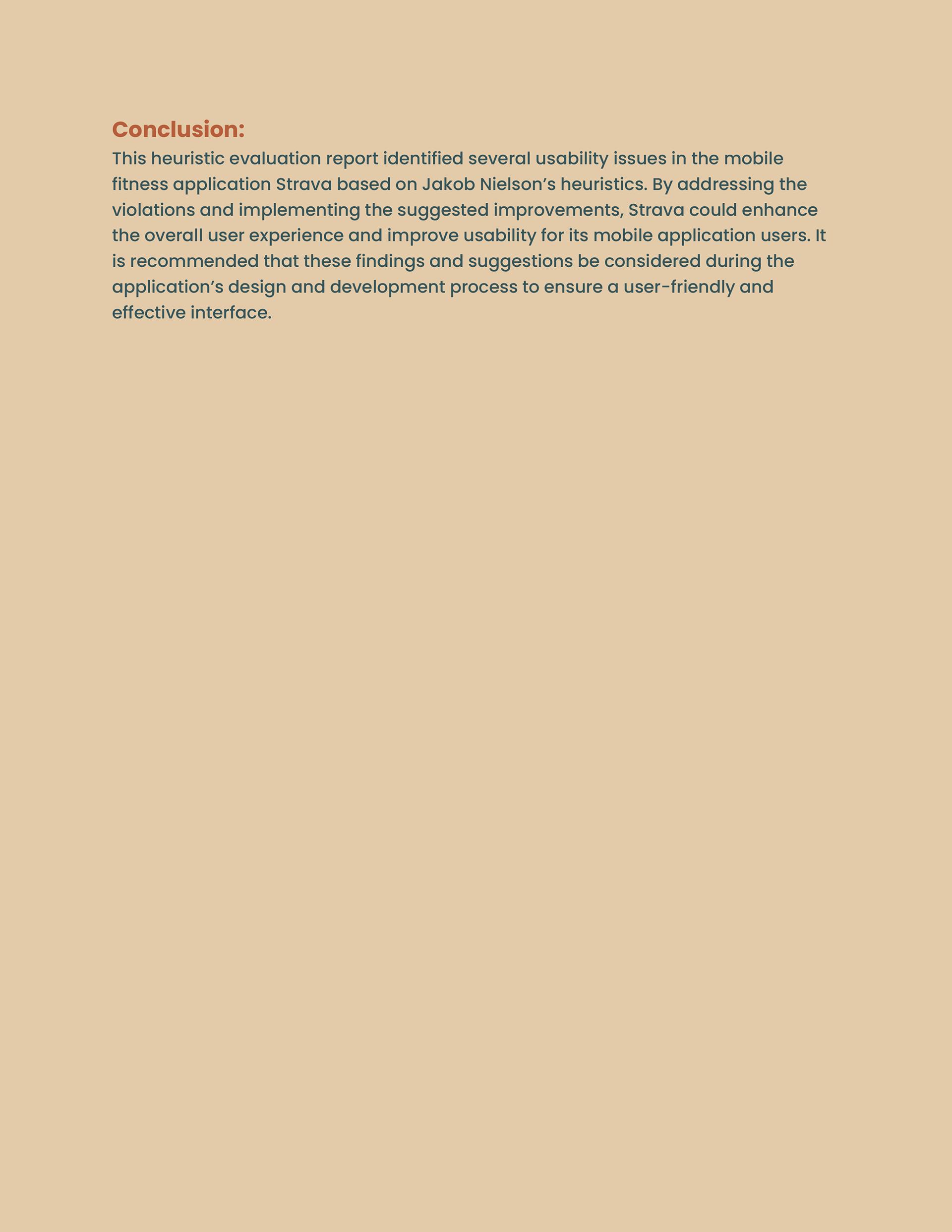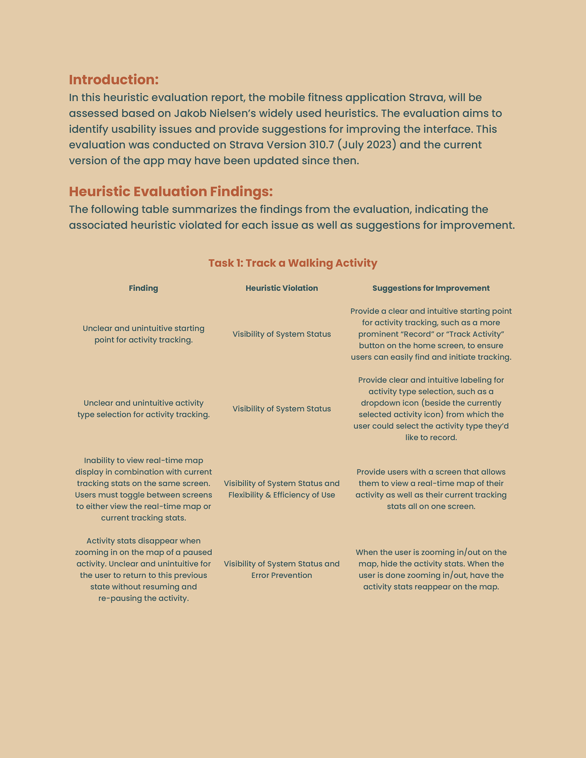 This work presents the findings of a heuristic evaluation of the Strava mobile application, assessed against Jakob Nielsen’s usability heuristics. Core user tasks—including activity tracking, social interaction, challenges, and profile management—were evaluated to identify usability issues related to system visibility, efficiency, error prevention, and visual clarity. The evaluation resulted in targeted recommendations aimed at improving usability, reducing user confusion, and strengthening overall interaction quality.