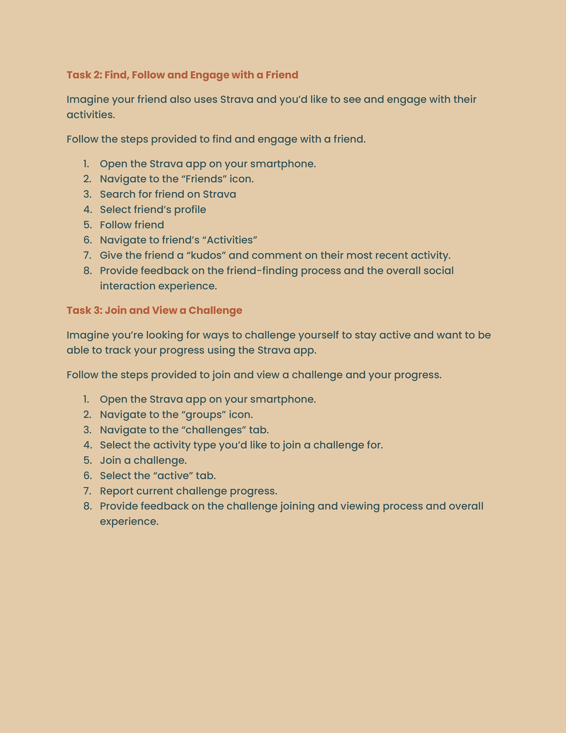 This work involved designing a structured set of evaluation tasks and scenarios to assess the usability of the Strava mobile application. The tasks guided participants through core workflows—including activity tracking, social interaction, challenges, and profile management—providing realistic context for usability testing and ensuring consistent, measurable evaluation of key features and user interactions.